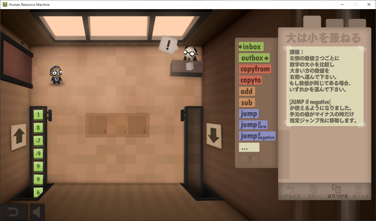 左側の数値2つごとに数字の大小を比較し大きい方の数値を右側に運んで下さい。もし数値が同じである場合、いずれかを運んで下さい。[JUMP if negative]が使えるようになりました。手元の値がマイナスの時だけ指定ジャンプ先に移動します。